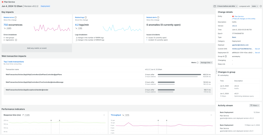 Hotfixes and new, significant code changes are captured using change tracking. Using an automated deployment pipeline integration or an API, you can record changes and see them as markers on the mobile summary page.