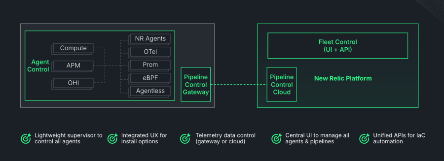 As we announced at New Relic Now+ in February, New Relic Control integrates three core components – Fleet Control, Agent Control, and Pipeline Control – into a single, unified platform, enabling DevOps and Platform teams to easily deploy, configure, and optimize their agents and telemetry data across any environment. Unlike fragmented, manual solutions, New Relic Control offers centralized visibility, proactive management, intelligent automation, and seamless extensibility for New Relic agents, integrations, and OpenTelemetry.
