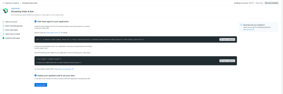 After setup, click See your data to access the monitoring dashboard. Keep in mind that data generation might take a few minutes as interactions occur. If your data hasn’t shown up right away, you can access the UI at: one.newrelic.com > All Capabilities > Streaming Video & Ads.
